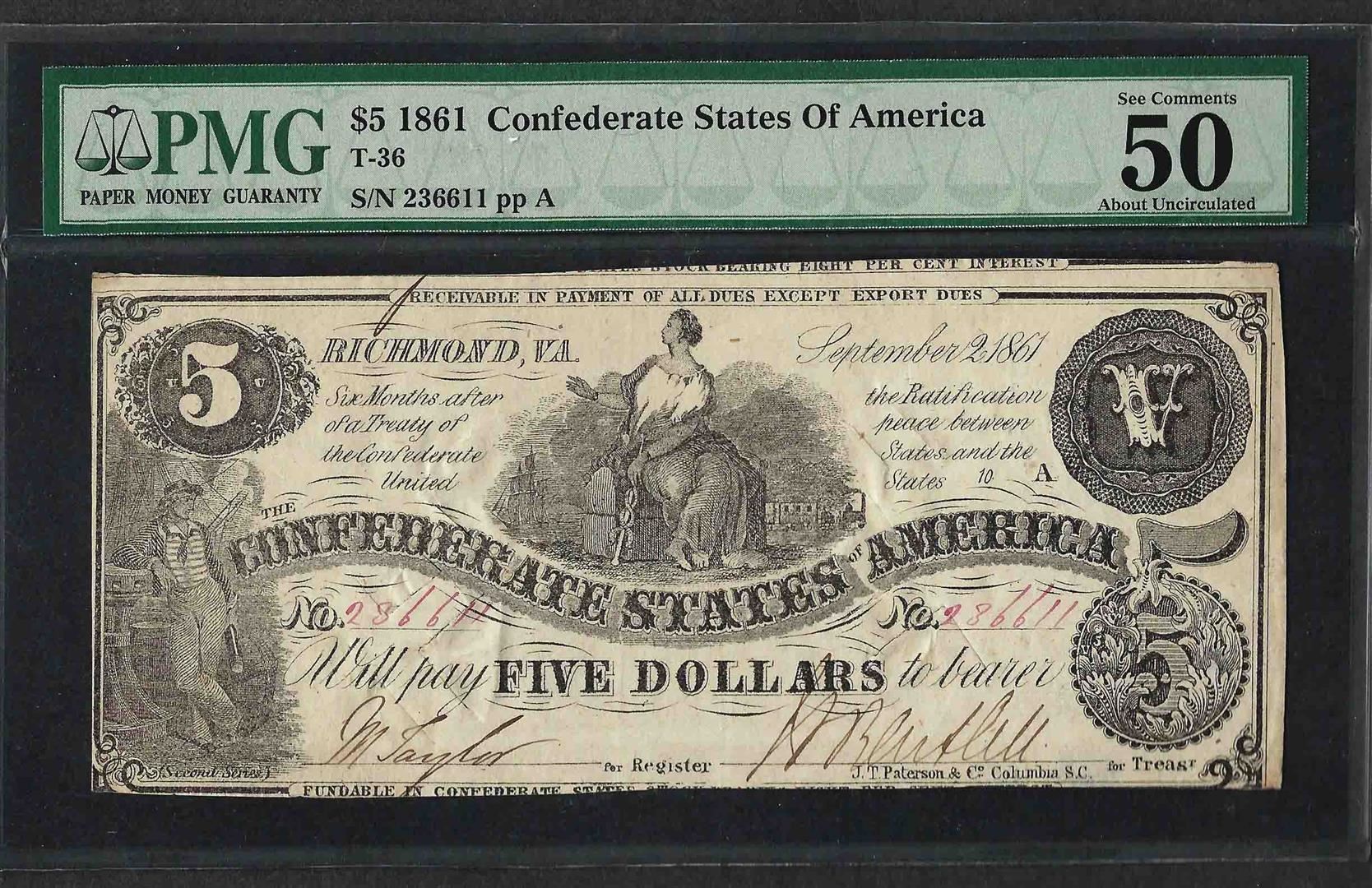 One 1861 $5 Confederate States of America Note T-36 PMG About Uncirculated 50. PMG Certified.