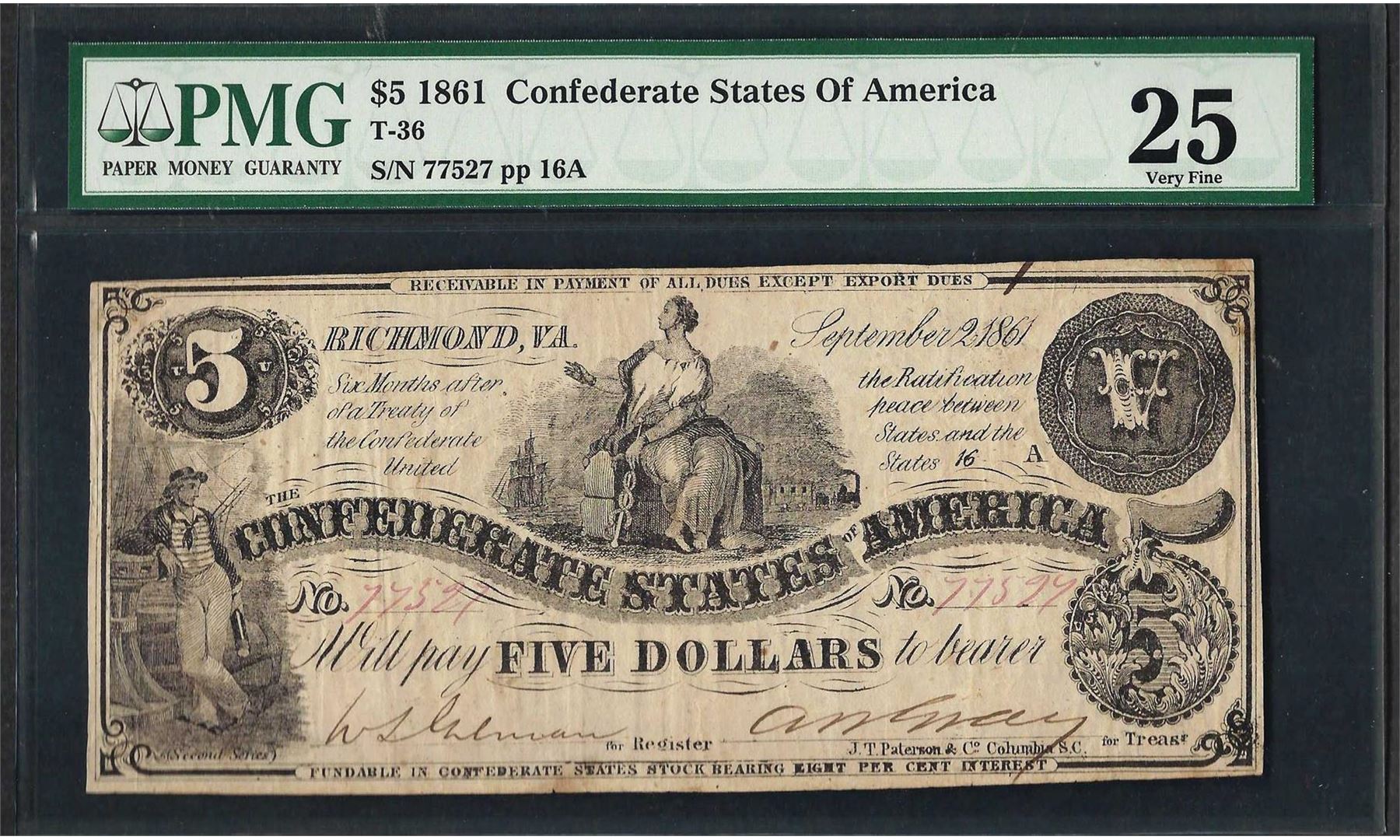 1861 $5 Confederate States of America Note T-36 PMG Very Fine 25