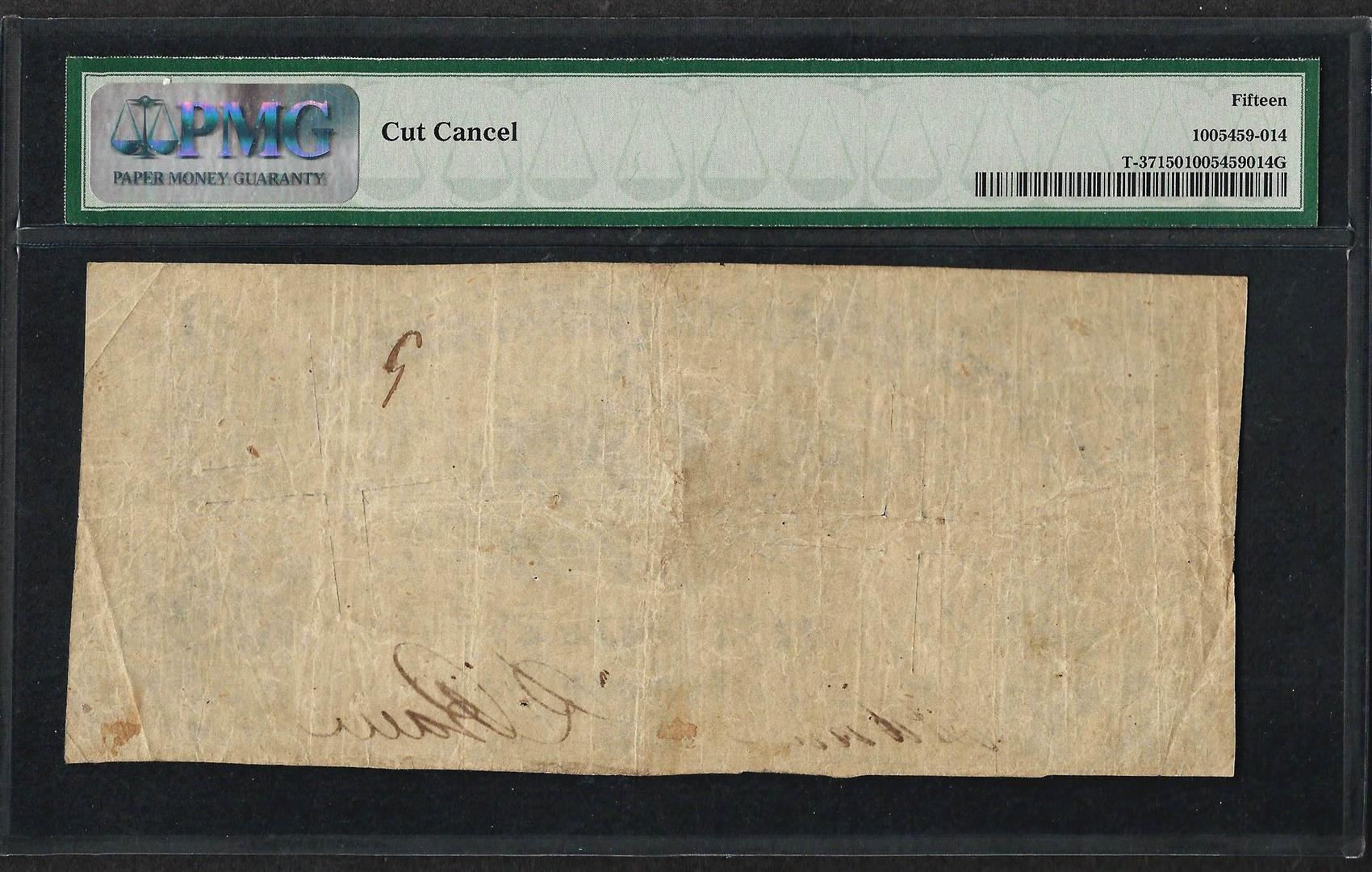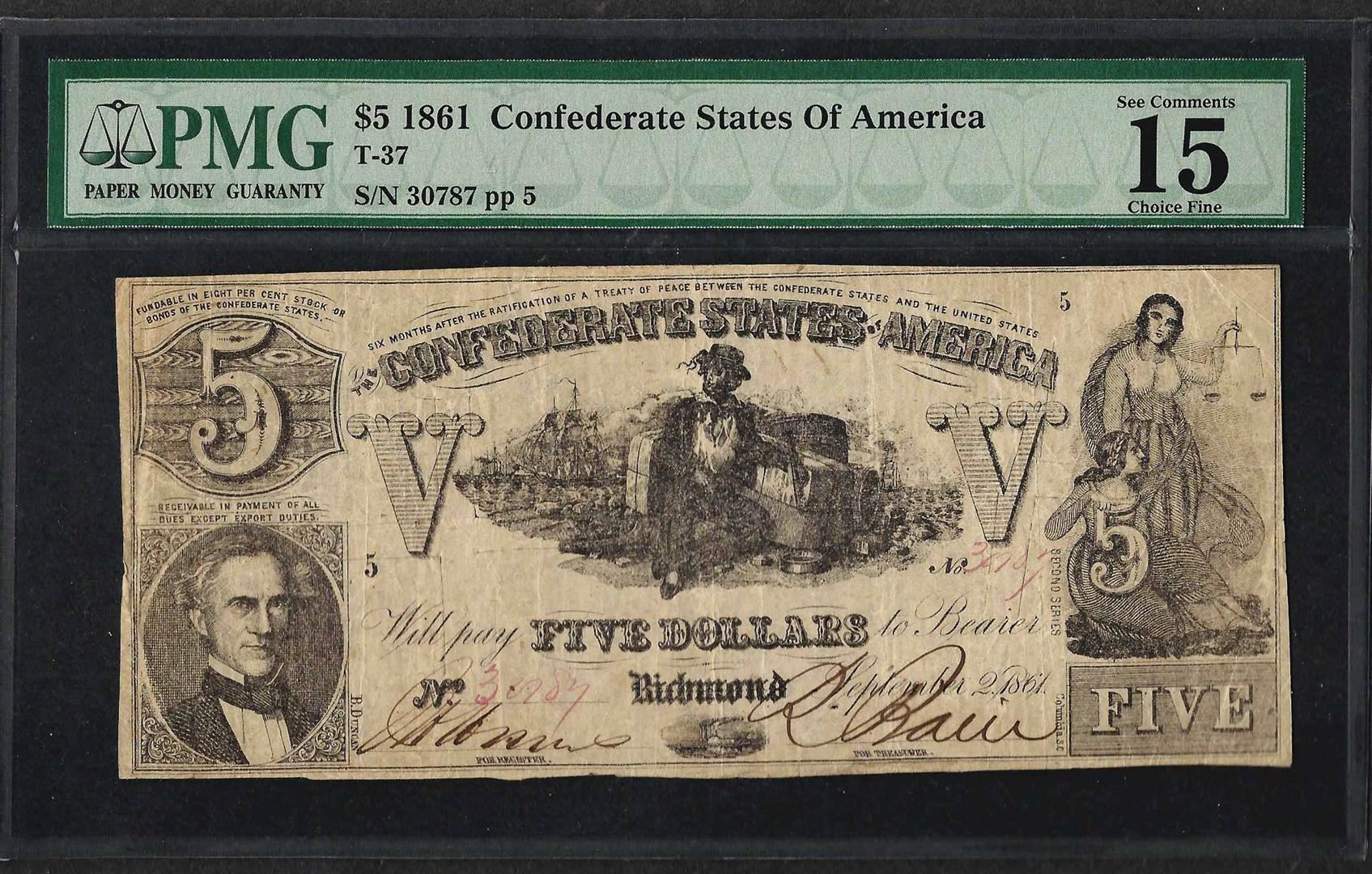 1861 $5 Confederate States of America Note T-37 PMG Choice Fine 15 Canceled