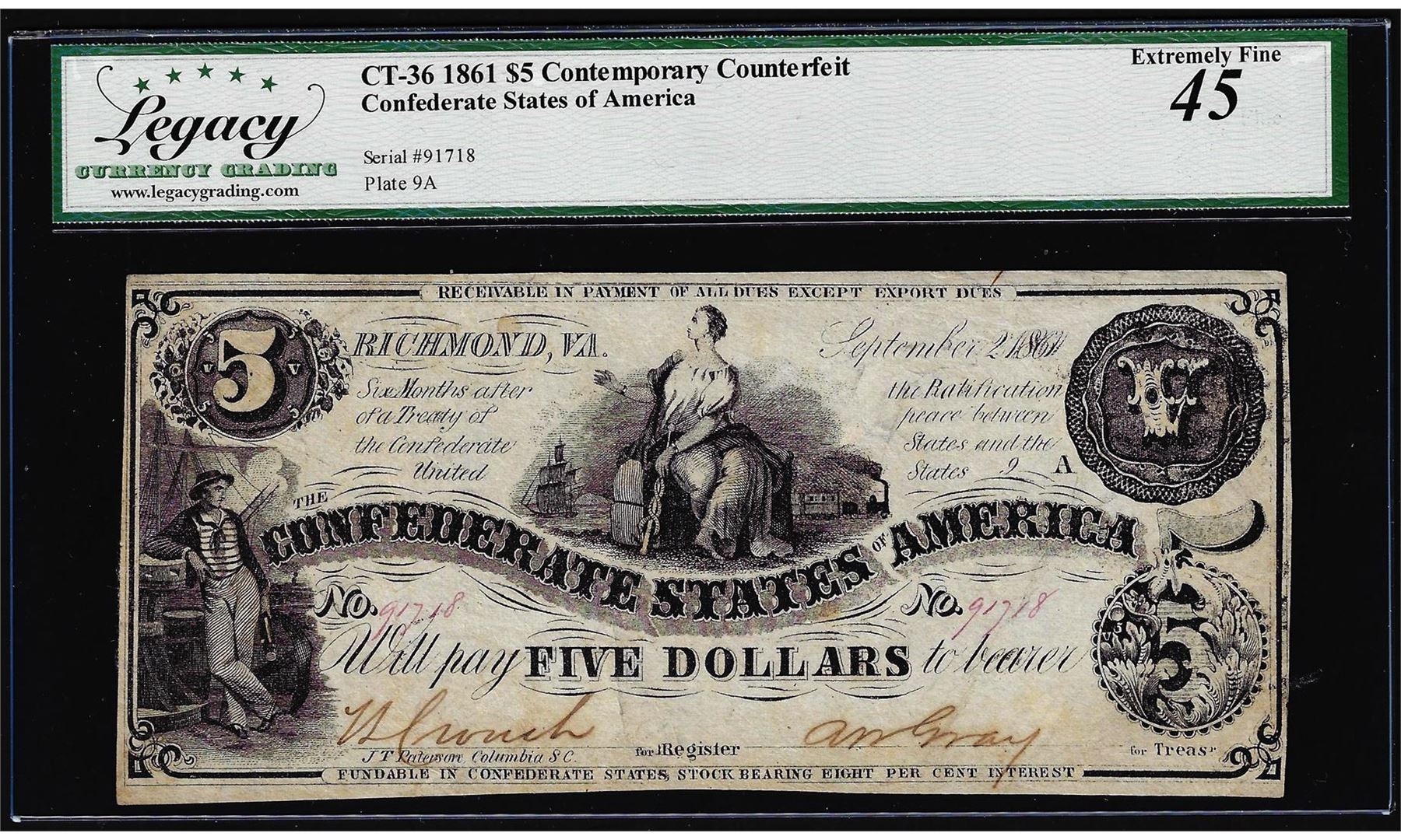 1861 $5 Contemporary Counterfeit Confederate States of America Note CT-36 Legacy XF45