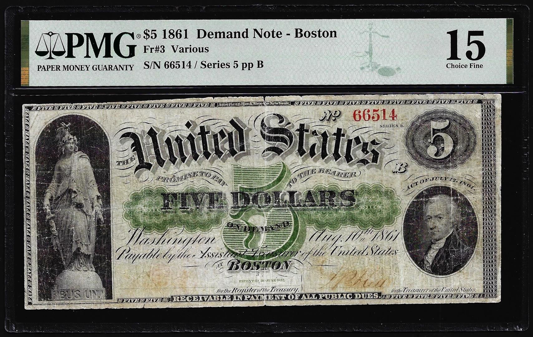 One 1861 $5 Demand Note Boston Fr.3 PMG Choice Fine 15. PMG Certified.