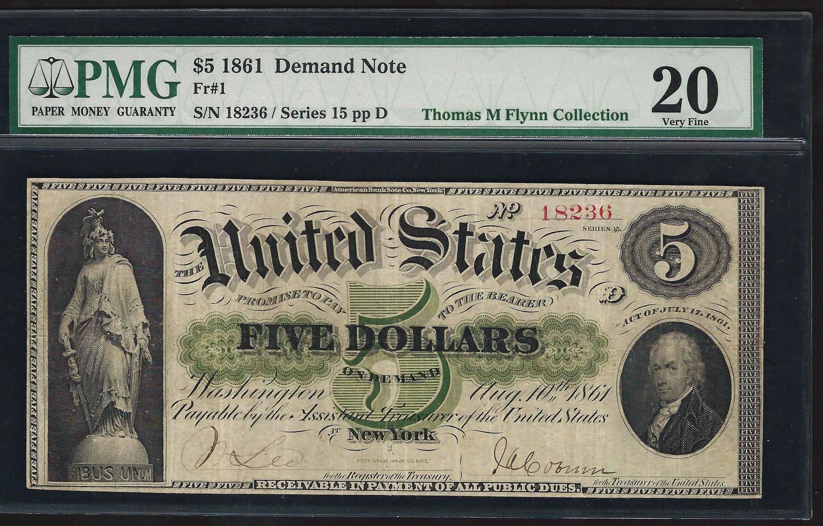 One 1861 $5 Demand Note Fr.1 PMG Very Fine 20. PMG Certified.
