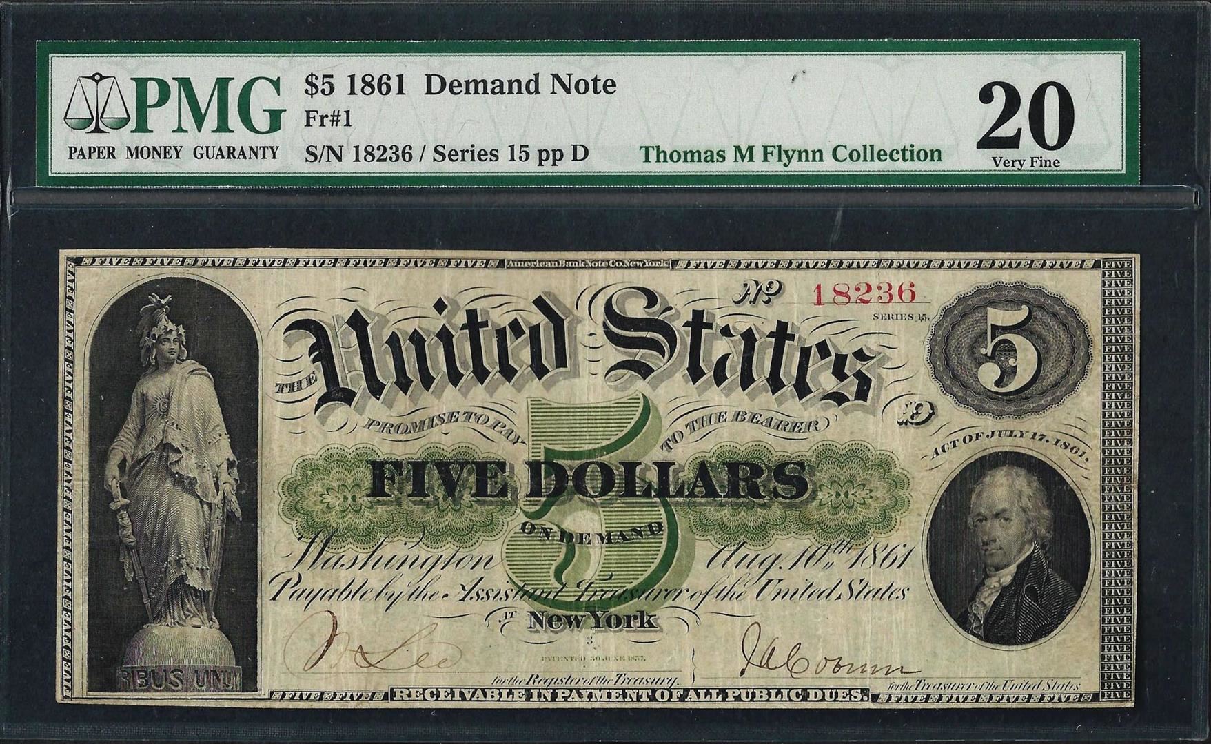 One 1861 $5 Demand Note Fr.1 PMG Very Fine 20. PMG Certified.