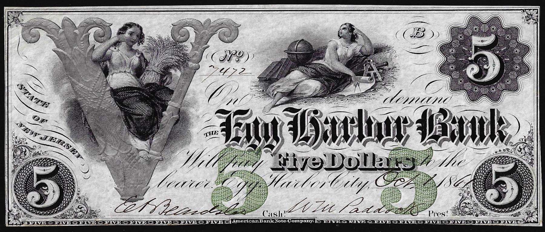 One 1861 $5 Egg Harbor Bank State of New Jersey Obsolete Note.