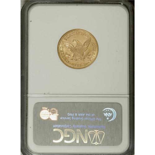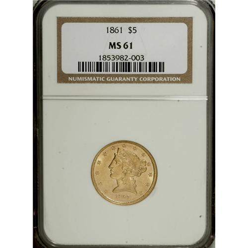 <B>1861 $5 MS61 NGC.</B></I> Sharply defined with pleasing luster. Peach-gold surfaces reveal a few small marks that limit the grade. Overall, quite a nice coin for the grade designation.<BR><BR><b>Shipping:</b> Coins & Currency (<a target="_blank" href="http://www.heritageauctions.com/common/shipping.php">view shipping information</a>)