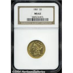 <B>1861<$5> MS62 NGC.</B></I> A well struck and flashy honey-gold piece with scattered minor abrasions on the obverse that are to be expected of the grade. Although the 1861 is the most available Half Eagle of its decade, a lustrous Mint State Half Eagle with a Civil War date is an uncommon occurrence. <BR><BR><B>Important notice:</B> Heritage usually auctions material at the rate of 200-250 lots per hour. On some occasions eBay Live bid software or the Internet may not be able to keep up with the pace of the auction. We recommend placing a realistic absentee bid now as insurance to avoid disappointment. Occasionally the auctioneer may eliminate or reject an eBay Live bid, and the auctioneer may also reopen a lot after the close of the eBay live bidding (usually because we missed an audience bid), and may reject your bid even if it shows you as the winning bidder. By bidding via eBay Live, you agree that Heritage may award the lot to another bidder at its sole discretion under the circumstances described above or any other reasonable circumstances. Since eBay bids are not shown to us until we open the lot on the floor, we treat those bids just like floor bids. In most cases the floor responds before the eBay bid is presented to us, due to Internet lag time, so for consistency we have made it a policy that floor bids are always considered first over tie eBay live bids. Also please note that all Heritage lots purchased through eBay Live carry a 20% Buyer's Premium. Please make sure you read the Terms and Conditions before you bid. </span></font></tr></table></td></tr></table>