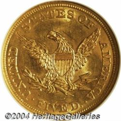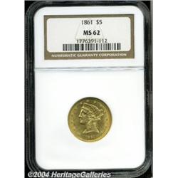 <B>1861<$5> MS62 NGC.</B></I> Fully struck with excellent luster characteristics, each side shows numerous small abrasions scattered about that account for the grade.<BR><I>From The Sarasota Collection.</B></I> <BR><BR><B>Important notice:</B> Heritage usually auctions material at the rate of 200-250 lots per hour. On some occasions eBay Live bid software or the Internet may not be able to keep up with the pace of the auction. We recommend placing a realistic absentee bid now as insurance to avoid disappointment. Occasionally the auctioneer may eliminate or reject an eBay Live bid, and the auctioneer may also reopen a lot after the close of the eBay live bidding (usually because we missed an audience bid), and may reject your bid even if it shows you as the winning bidder. By bidding via eBay Live, you agree that Heritage may award the lot to another bidder at its sole discretion under the circumstances described above or any other reasonable circumstances. Since eBay bids are not shown to us until we open the lot on the floor, we treat those bids just like floor bids. In most cases the floor responds before the eBay bid is presented to us, due to Internet lag time, so for consistency we have made it a policy that floor bids are always considered first over tie eBay live bids. Also please note that all Heritage lots purchased through eBay Live carry a 20% Buyer's Premium. Please make sure you read the Terms and Conditions before you bid. </span></font></tr></table></td></tr></table>