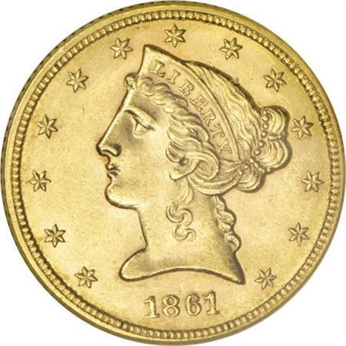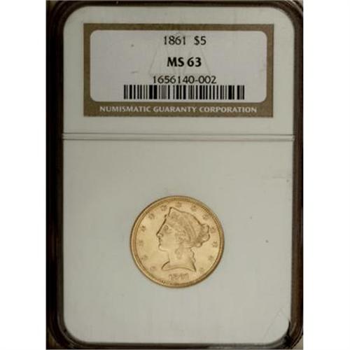 <B>1861 $5 MS63 NGC.</B></I> The 1861 half eagle enjoys constant popularity with type collectors, who recognize the value in its ample mintage and generally strong visual appeal. The Select piece offered here emphasizes the latter virtue, with shining straw-gold surfaces and boldly impressed devices that offer excellent quality for the grade assigned. Census: 27 in 63, 37 finer (12/07).<BR><BR><B>Coin Engraver:</B> Christian Gobrecht<BR><BR><b>Shipping:</b> Coins & Currency (<a target="_blank" href="http://www.heritageauctions.com/common/shipping.php">view shipping information</a>)