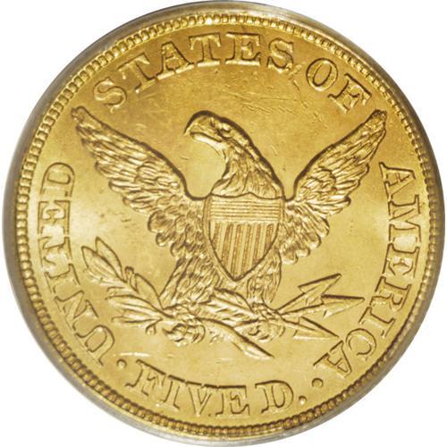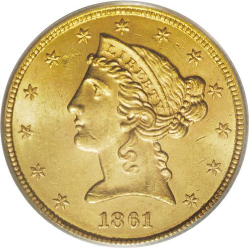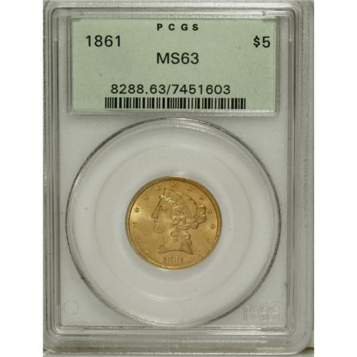 1861 $5 MS63 PCGS. A satiny, subtly lustrous yellow-or