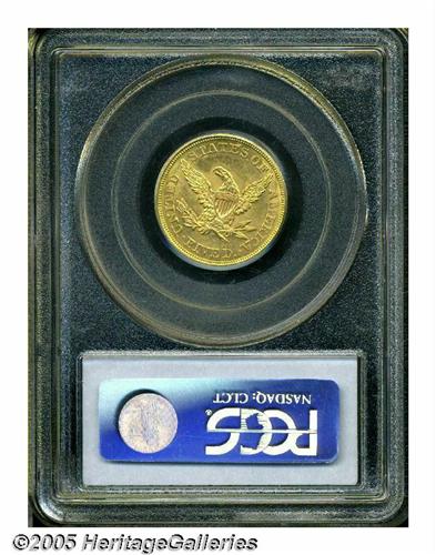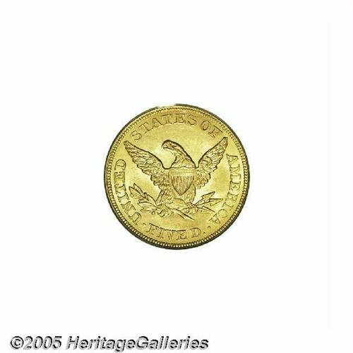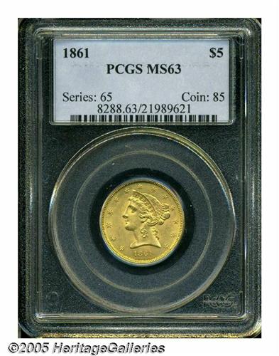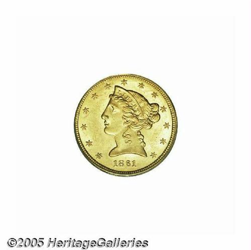 <B>1861<$5> MS63 PCGS.</B></I> Bright and attractive greenish-gold patina occupies both sides. Most design features are sharp including the majority of Liberty's hair details (save for the curls near the temple), the obverse stars (all of which show their radials), and nearly all of the eagle's plumage. A few minute marks consistent with the grade are noted on both sides. Numismatists are fortunate insofar as a tiny hoard of perhaps a few dozen pieces was apparently set aside at the time of issue, but these are barely sufficient to accommodate the demand created by the many specialists and type collectors who need quality examples for their cabinets. Population: 30 in 63, 47 finer (6/05).