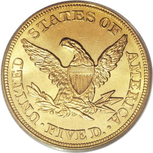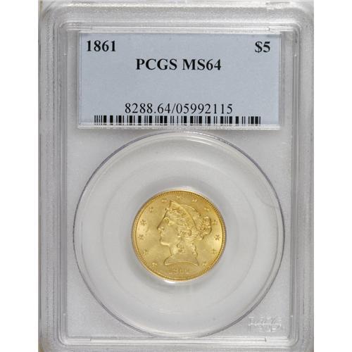 <B>1861 $5 MS64 PCGS.</B></I> A popular issue from the inception of the Civil War, produced to the extent of 688,084 circulation strikes. The present example is well struck throughout, with pleasing radiant luster and attractive honey-lime coloration. Both sides of the piece are well preserved and free of individually noticeable marks, although a small rough patch is noted on the reverse under ATES. The high mintage makes this a common date, but it is surprisingly scarce in the better grades of Mint State. Interestingly, the date appears somewhat small and delicate, and each successive digit is shallower in the die than the one to its (facing) left. A historic coin, from the year that Abraham Lincoln was inaugurated, 10 Southern states seceded from the Union (South Carolina seceded in 1860), and the Civil War began with the shelling of Fort Sumter, S.C. Population: 41 in 64, 8 finer (2/07).<BR><BR><b>Shipping:</b> Coins & Currency (<a target="_blank" href="http://www.heritageauctions.com/common/shipping.php">view shipping information</a>)