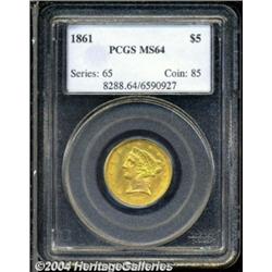 <table><tbody><tr><td><table> <TR><TD width="100%"><TABLE cellSpacing=1 cellPadding=3 width="100%" border=0><TBODY><TR><TD width="100%" bgColor=#79735c><FONT face=arial color=#ffffff size=3><B>Description</B> </FONT></TD></TR><TR><TD width="100%" bgColor=#ffffff><FONT face=arial size=2><B>1861 $5 MS64 PCGS.</B></I> With 688,150 pieces struck, the 1861 is an available and popular No Motto type coin. It is not only because of this date's availability that it is so popular, but also because of the high quality most of the surviving examples are found in. This is a satiny example that is fully struck in all areas. The rich golden-orange coloration shows only one variation in hue, a dab of pale lilac on Liberty's neck. Population: 41 in 64, 8 finer (10/03). </FONT></TD></TR></TBODY></TABLE></TD></TR></TBODY></TABLE><BR><A name=PricesRealized></A><TABLE cellSpacing=0 cellPadding=0 width="100%" bgColor=#000000 border=0><TBODY><TR><TD width="100%"><TABLE cellSpacing=1 cellPadding=3 width="100%" border=0><TBODY><TR><TD width="100%" bgColor=#79735c><A name=PR><FONT face=arial color=#ffffff size=3><B>Previous Prices from Heritage Auctions</B> </FONT></A></TD></TR><TR><TD bgColor=#f6f6ed><TABLE cellSpacing=0 cellPadding=0 width="100%" border=1><TBODY><TR><TD align=middle width="33%"><B>Date</B></TD><TD align=middle width="33%"><B>Service</B></TD><TD align=middle width="33%"><B>Price</B></TD></TR><TR bgColor=whitesmoke><TD width="33%"><B>04/16/2002</B></TD><TD width="33%">PCGS</TD><TD width="33%">$8,050.00</TD></TR><TR bgColor=whitesmoke><TD width="33%"><B>01/11/2003</B></TD><TD width="33%">NGC</TD><TD width="33%">$6,785.00</TD></TR><TR bgColor=whitesmoke><TD width="33%"><B>05/05/2000</B></TD><TD width="33%">PCGS</TD><TD width="33%">$7,475.00</TD></TR><TR bgColor=whitesmoke><TD width="33%"><B>06/06/1998</B></TD><TD width="33%">NGC</TD><TD width="33%">$18,400.00</TD></TR><TR bgColor=whitesmoke><TD width="33%"><B>10/01/1999</B></TD><TD width="33%">PCGS</TD><TD width="33%">$9,775.00</TD></TR></TBODY></TABLE></TD></TR><TR><TD bgColor=#ffffff><FONT face=arial size=1 ?>PLEASE NOTE: All prices realized reflect the final hammer price PLUS the buyer's premium in auctions that charge a buyer's premium. Each item has a notation at the top of the listing indicating whether that lot included a buyer's premium. Example: A item that sells with a final hammer price of $100 and a 20% buyer's premium will display with a price realized of $120. All information listed is intended to be as accurate as possible, but errors are possible. Please use this guide carefully and inform us of any inaccuracies. </FONT></TD></TR></TBODY></TABLE></TD></TR></TBODY></TABLE><BR><TABLE cellSpacing=0 cellPadding=0 width="100%" bgColor=#000000 border=0><TBODY><TR><TD width="100%"><TABLE cellSpacing=1 cellPadding=3 width="100%" border=0><TBODY><TR><TD width="100%" bgColor=#79735c colSpan=6><FONT face=arial color=#ffffff size=3><B>Price Guide*</B> </FONT></TD></TR><TR bgColor=#f6f6ed><TD align=middle><B>Grade</B> </TD><TD align=middle><B>Coin World<BR>(Trends)</B> </TD><TD align=middle><B>Numismedia<BR>Retail</B> </TD><TD align=middle><B>Numismedia<BR>Wholesale</B> </TD><TD align=middle><B>Coin<BR>Universe</B> </TD><TD align=middle><B>Heritage<BR>Value Index</B> </TD></TR><TR bgColor=#ffffff><TD align=middle>63</TD><TD align=right>$7,500.00</TD><TD align=right>---</TD><TD align=right>$5,375.00</TD><TD align=right>$7,400.00</TD><TD align=right>$5,041.50</TD></TR><TR style="FONT-WEIGHT: bold" bgColor=#cccfdd><TD align=middle>64</TD><TD align=right>$12,500.00</TD><TD align=right>---</TD><TD align=right>$7,350.00</TD><TD align=right>$11,500.00</TD><TD align=right>$7,280.00</TD></TR><TR bgColor=#ffffff><TD align=middle>65</TD><TD align=right>---</TD><TD align=right>---</TD><TD align=right>$22,250.00</TD><TD align=right>$36,500.00</TD><TD align=right>$22,900.00</TD></TR><TR bgColor=#ffffff><TD colSpan=6><FONT size=1>*All information listed is intended to be as accurate as possible, but errors are possible. No item may be returned or refused based on this information which is provided as a service to our customers. You should contact each pricing source directly to determine the accuracy of this information. </FONT></TD></TR></TBODY></TABLE></TD></TR></TBODY></TABLE><BR><TABLE cellSpacing=0 cellPadding=0 width="100%" bgColor=#000000 border=0><TBODY><TR><TD width="100%"><TABLE cellSpacing=1 cellPadding=3 width="100%" border=0><TBODY><TR><TD width="100%" bgColor=#79735c><FONT face=arial color=#ffffff size=3><B>Population Guide</B> </FONT></TD></TR><TR bgColor=#ffffff><TD align=middle><!-- Begin Output of Population Grid--><TABLE cellSpacing=0 cellPadding=0 width="100%" border=0><TBODY><TR><TD vAlign=center><TABLE cellSpacing=0 width="100%" border=1 cellsadding="3"><TBODY><TR><TD vAlign=center><TABLE cellSpacing=0 cellPadding=3 width="100%" border=1><TBODY><TR><TD vAlign=center align=middle bgColor=#f0f1e8 colSpan=2 <CENTER><FONT face=Arial size=2><B>PCGS Pop </B></FONT><CENTER></CENTER></TD><TD vAlign=center align=middle bgColor=#f0f1e8 colSpan=2><CENTER><FONT face=Arial size=2><B>NGC Pop</B></CENTER></FONT></TD></TR><TR><TD vAlign=center><FONT face=Arial size=2>(64)</FONT> </TD><TD vAlign=center align=right><FONT face=Arial size=2>41</FONT> </TD><TD vAlign=center><FONT face=Arial size=2>(64)</FONT> </TD><TD vAlign=center align=right><FONT face=Arial size=2>28</FONT> </TD></TR><TR><TD vAlign=center><FONT face=Arial size=2>(>64)</FONT> </TD><TD vAlign=center align=right><FONT face=Arial size=2>8</FONT> </TD><TD vAlign=center><FONT face=Arial size=2>(>64)</FONT> </TD><TD vAlign=center align=right><FONT face=Arial size=2>8</FONT> </TD></TR></TBODY></TABLE></TD></TR></TBODY></TABLE></TD></TR></TBODY></TABLE><!-- End Output of Population Grid--></TD></TR></TBODY></TABLE></TD></TR></TBODY></TABLE><BR><TABLE cellSpacing=0 cellPadding=0 width="100%" bgColor=#000000 border=0><TBODY><TR> <font color='#000000'><span style='background-color: #FFFFFF'><td bgcolo