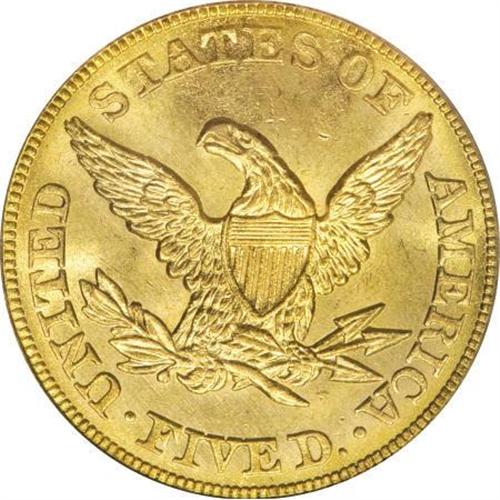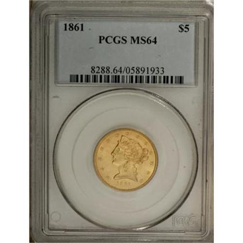 <B>1861 $5 MS64 PCGS.</B></I> Although a common date because of its high mintage, the 1861 issue, from the commencement of Civil War hostilities, is a popular choice for a No Motto half eagle. This piece boasts satiny, orange-gold surfaces that are well struck, with only a few light abrasions preventing a Gem grade. Population: 41 in 64, 8 finer (12/07). <BR><BR><B>Coin Engraver:</B> Christian Gobrecht<BR><BR><b>Shipping:</b> Coins & Currency (<a target="_blank" href="http://www.heritageauctions.com/common/shipping.php">view shipping information</a>)