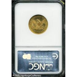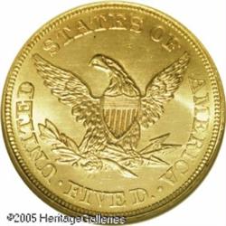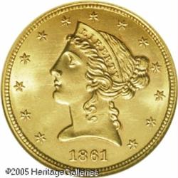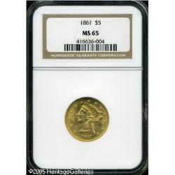 <B>1861 $5 MS65 NGC.</B></I> The 1861 is not a rare date by No Motto standards, however, the vast majority of survivors are in circulated grades. Most Mint State pieces are MS62 or lower, since they were improperly stored for many years and the soft gold alloy readily acquires bagmarks. This well struck Gem is a fortunate exception, however. The cheek and fields are remarkably clean, aside from a faint mark west of the chin and a minor blemish beneath the fletchings. Few No Motto pieces of any date can compete with the quality of the present example. Worthy of the finest gold type set. Lot:7831