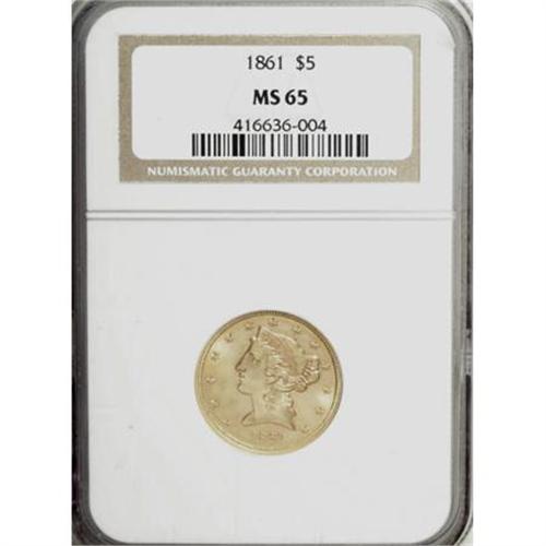 <B>1861 $5 MS65 NGC.</B></I> The 1861 is not a rare date by No Motto standards, however, the vast majority of survivors are in circulated grades. Most Mint State pieces are MS62 or lower, since they were improperly stored for many years and the soft gold alloy readily acquires bagmarks. This well struck Gem is a fortunate exception, however. The cheek and fields are remarkably clean, aside from a faint mark west of the chin and a minor blemish beneath the fletchings. Few No Motto pieces of any date can compete with the quality of the present example. Worthy of the finest gold type set. Census: 8 in 65, 2 finer (11/07).<BR><I>From The Madison Collection.</B></I><BR><BR><B>Coin Engraver:</B> Christian Gobrecht<BR><BR><b>Shipping:</b> Coins & Currency (<a target="_blank" href="http://www.heritageauctions.com/common/shipping.php">view shipping information</a>)