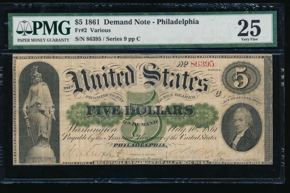 One 1861 $5 Philadelphia Demand Note PMG 25.