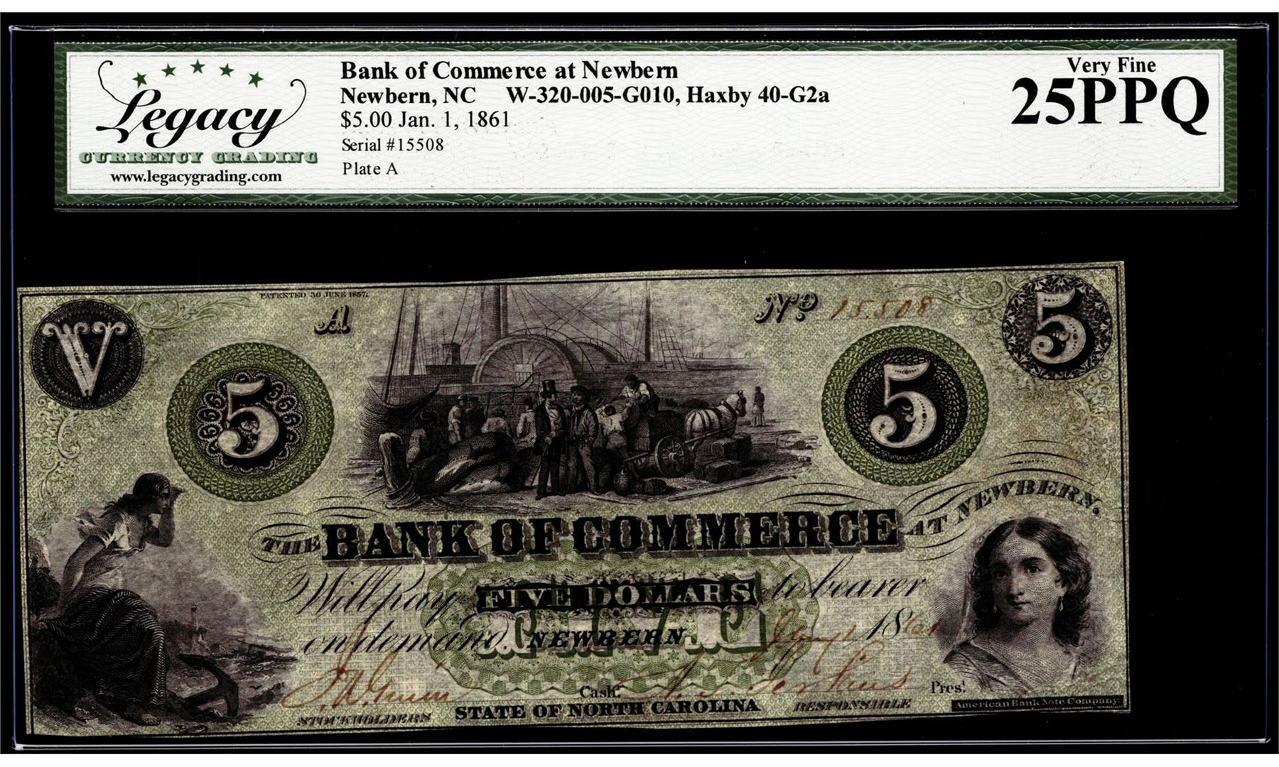 One 1861 $5 The Bank of Commerce at Newbern, NC Obsolete Note Legacy Very Fine 25PPQ. Legacy Graded.