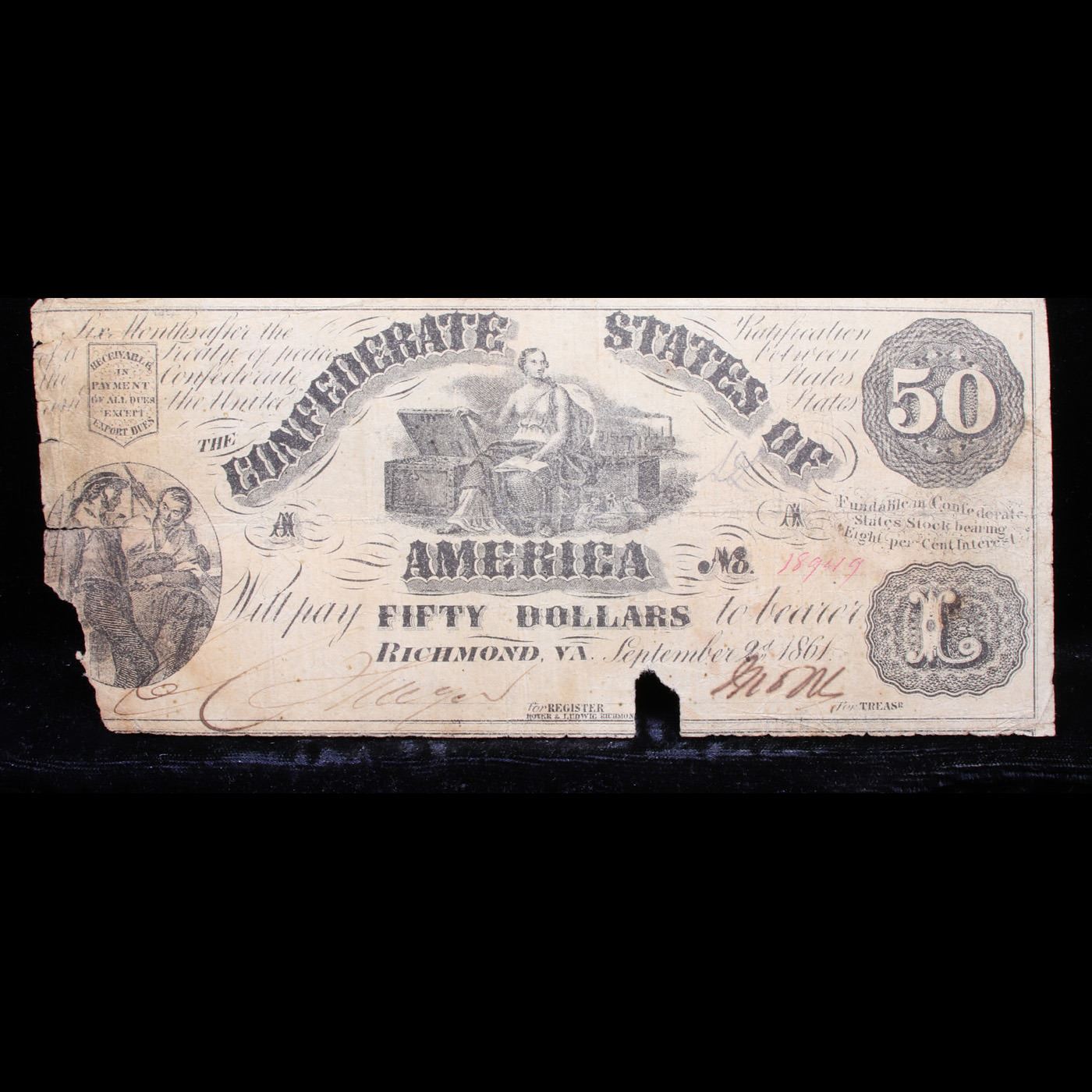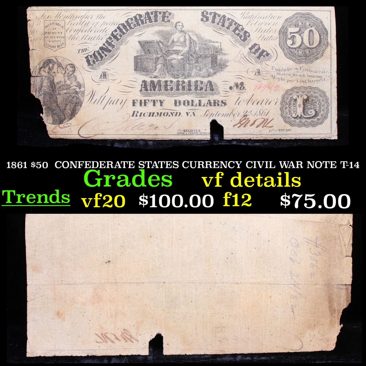 1861 $50 CONFEDERATE STATES CURRENCY CIVIL WAR NOTE T-14 Grades vf details. After the Civil War broke out in 1861, the newly established Confederate government began to issue it's own money as legal tender to the citizens of the South. The gamble was that if the South won the war, the money would be redeemable. The 1st note from the Government of the Confederate States of America was issued in April of 1861. From then on, notes were issued on through 1864. Almost every Confederate note was painstakingly hand signed and numbered. It is not uncommon for these notes to have uneven, or rough borders since scissors or shears were used to hastily cut the sheets of notes apart.