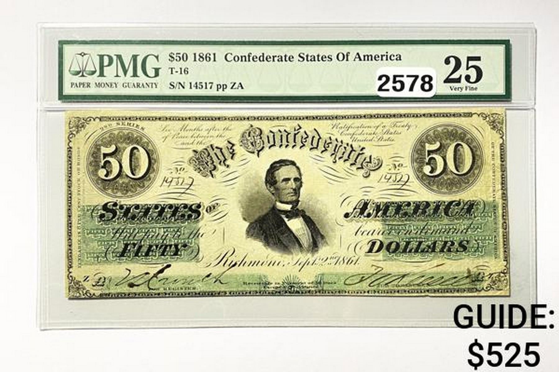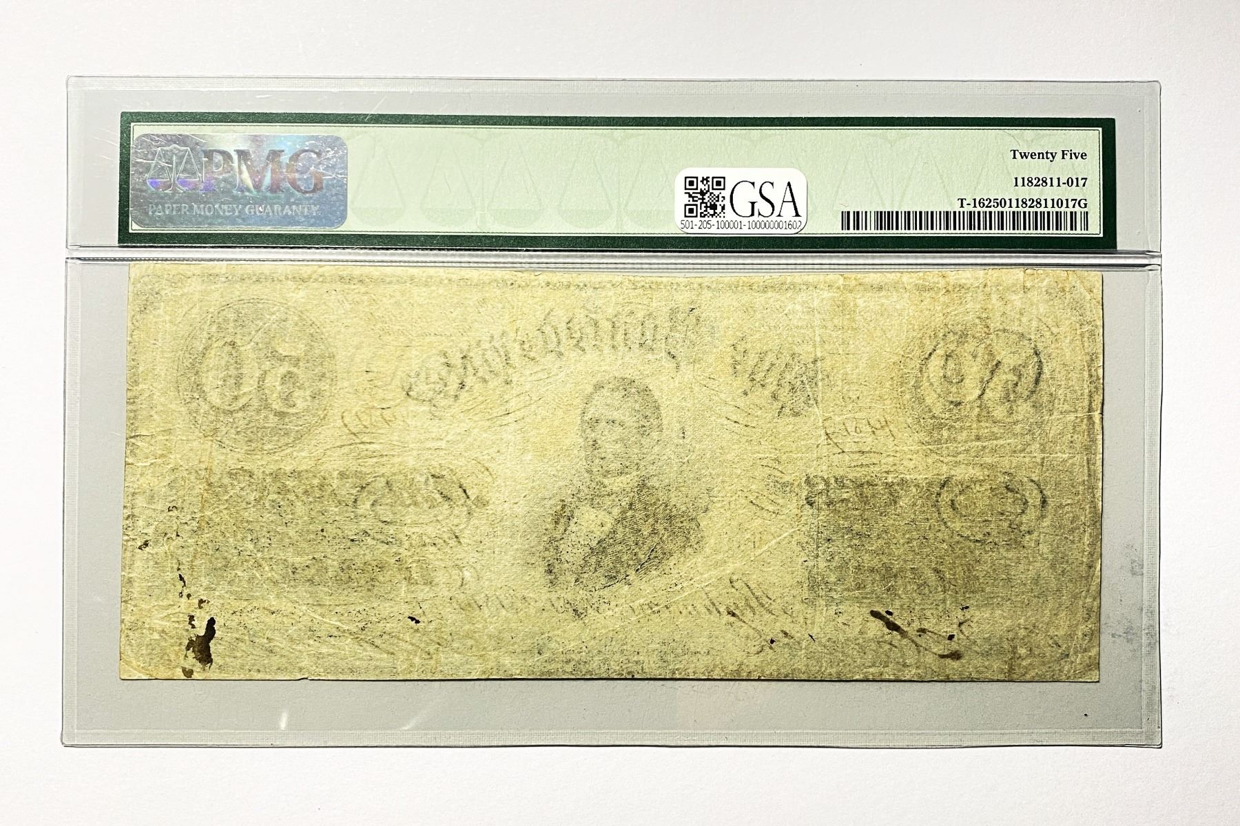 f. Notes sold referencing a third-party grading service are sold “AS IS” without any express or implied warranty, except for guarantee by GSA that they are genuine. Grading, condition or other attributes of any Product may have a material effect on its value and the opinion of others, including third-party grading services such as PCGS Currency and PMG may differ with that of GSA. GSA shall not be bound by any prior or subsequent opinion, determination, or certification by any grading service. Bidders specifically waive any claim to right of return of any Product because of the opinion, determination, or certification, or lack thereof, by any grading service. Certain warranties may be available from the grading services and Bidders are referred to them for further details: Paper Money Guaranty (PMG), PO Box 4711, Sarasota, FL 34230; PCGS Currency, PO Box 10470, Peoria, IL 61612-0470; PCGS Gold Shield, PO Box 9458, Newport Beach, CA 92658. Third-party graded notes are not returnable for any reason whatsoever.