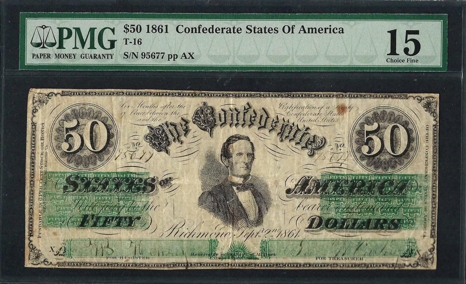 One 1861 $50 Confederate States of America Note T-16 PMG Choice Fine 15. PMG Certified.