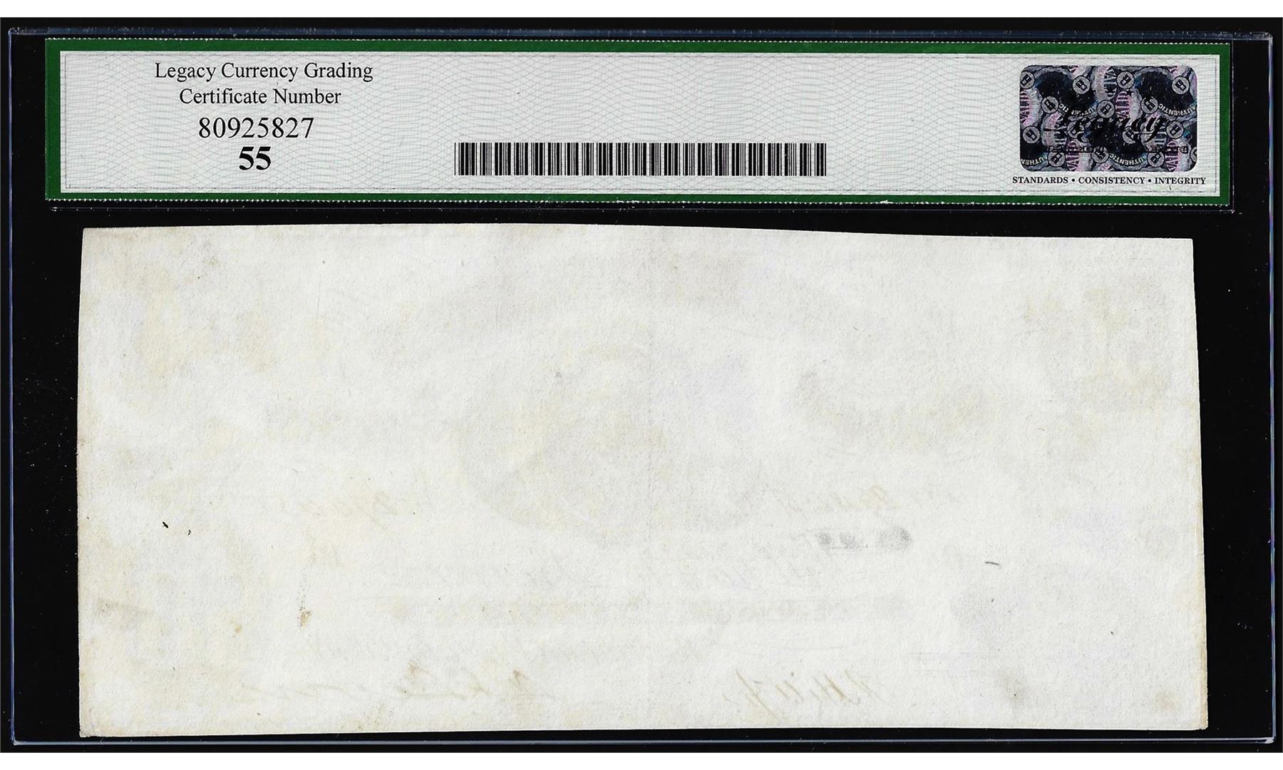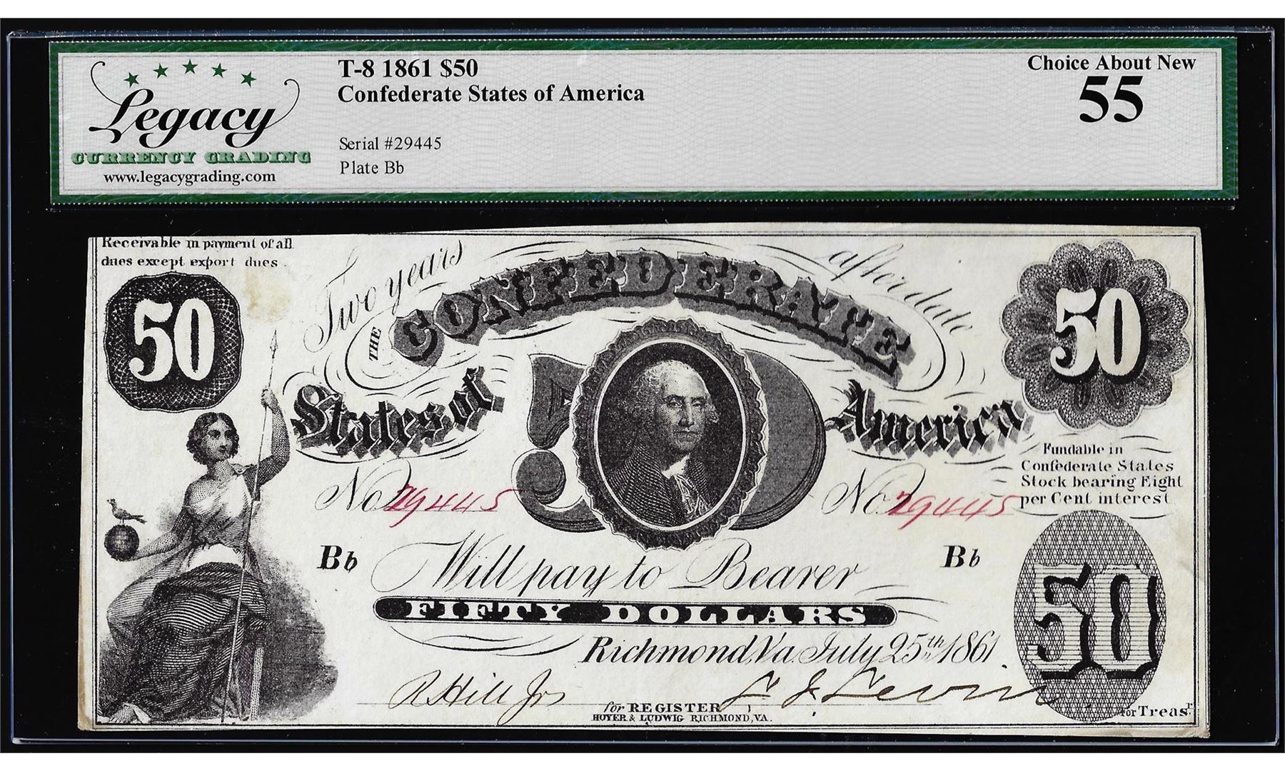 One 1861 $50 Confederate States of America Note T-8 Legacy Choice About New 55. Legacy Graded.