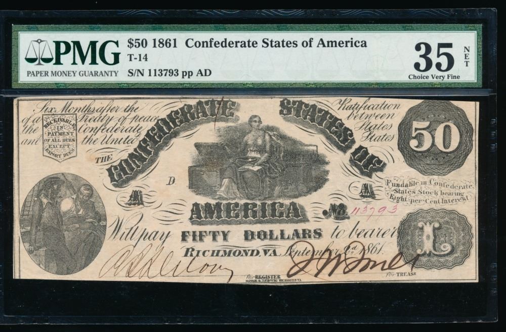 One 1861 $50 T-14 Confederate PMG 35NET.