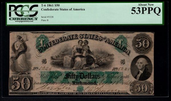 One 1861 $50 T-6 Confederate States of America PCGS 53PPQ