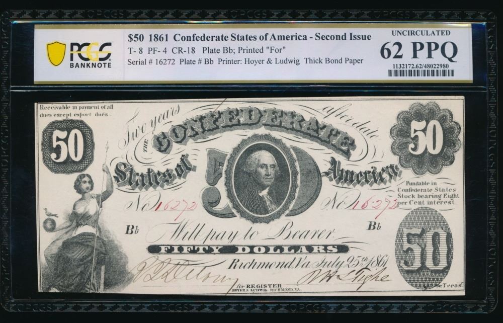 One 1861 $50 T-8 Confederate PCGS 62PPQ.