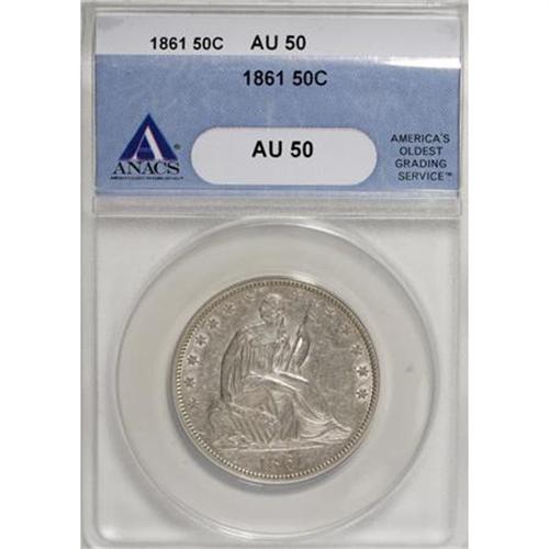 <B>1861 50C AU50 ANACS.</B></I> NGC Census: (5/289). PCGS Population (19/268). Mintage: 2,888,400. Numismedia Wsl. Price for NGC/PCGS coin in AU50: $192. (#6302)<BR><BR><B>Coin Engraver:</B> Christian Gobrecht<BR><BR><b>Shipping:</b> Coins & Currency (<a target="_blank" href="http://www.heritageauctions.com/common/shipping.php">view shipping information</a>)