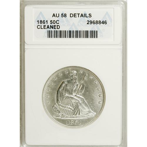 <B>1861 50C --Cleaned--ANACS. AU58 Details.</B></I> NGC Census: (51/196). PCGS Population (28/205). Mintage: 2,888,400. Numismedia Wsl. Price for NGC/PCGS coin in AU58: $221. (#6302)<BR><BR><b>Shipping:</b> Coins & Currency (<a target="_blank" href="http://www.heritageauctions.com/common/shipping.php">view shipping information</a>)