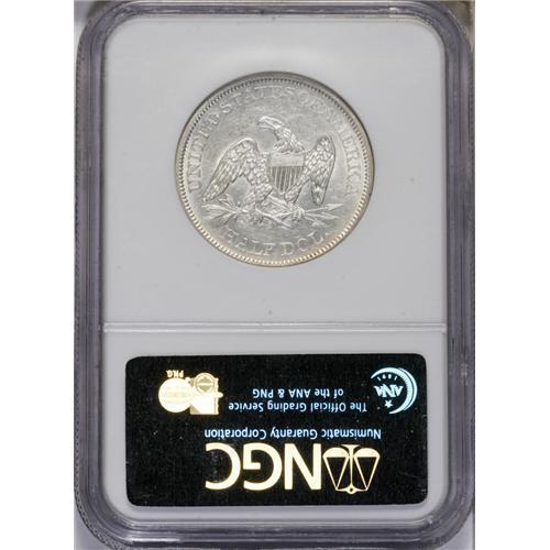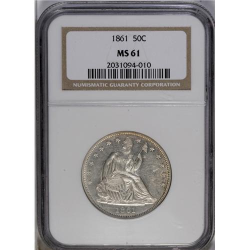 <B>1861<50C> MS61 NGC.</B></I> A crisply struck Civil War Seated half with subdued luster and light gold peripheral toning. Major marks are absent, but a mint-made strike-through resides near star 11.