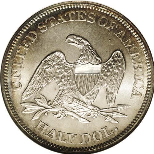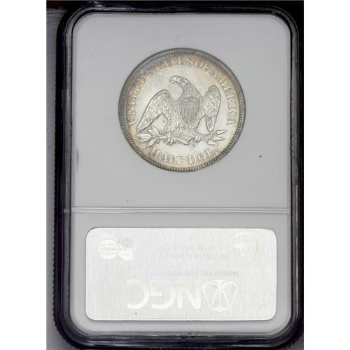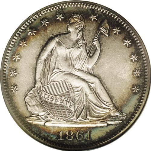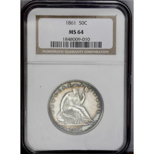 <B>1861<50C> MS64 NGC.</B></I> A bold striking with elliptical patterns of steel-blue and coppery-gold toning framing the obverse and a thin crescent of similar coloration on the left side of the reverse. The 1861 is one of the more obtainable No Motto half dollars in Mint State, but enjoys added demand as a Civil War date. Census: 60 in 64, 30 finer (4/06).