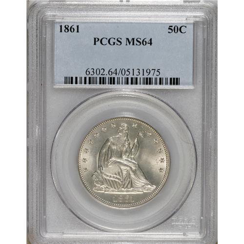 <B>1861 50C MS64 PCGS.</B></I> A solidly struck and highly lustrous near-Gem from the Civil War years. Only a few stray marks appear on the cream-tinted surfaces. An uncommonly appealing No Motto piece. Population: 63 in 64, 27 finer (3/07).<BR><BR><b>Shipping:</b> Coins & Currency (<a target="_blank" href="http://www.heritageauctions.com/common/shipping.php">view shipping information</a>)