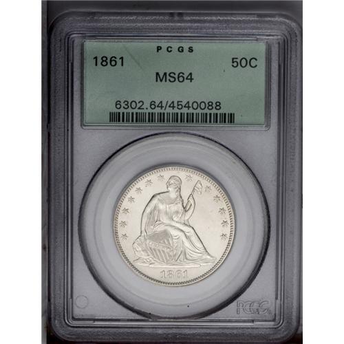 <B>1861<50C> MS64 PCGS.</B></I> Lustrous and untoned with a pleasing satiny sheen and nicely preserved surfaces. The striking details are very sharp on all of the obverse stars and on Liberty's head. Only the eagle's left (facing) talon feathers show slight weakness. Peripheral die cracks and a few small abrasions are noted on each side. Population: 73 in 64, 25 finer (3/06). <BR><BR><B>Important notice:</B> Heritage usually auctions material at the rate of 200-250 lots per hour. On some occasions eBay Live bid software or the Internet may not be able to keep up with the pace of the auction. We recommend placing a realistic absentee bid now as insurance to avoid disappointment. Occasionally the auctioneer may eliminate or reject an eBay Live bid, and the auctioneer may also reopen a lot after the close of the eBay live bidding (usually because we missed an audience bid), and may reject your bid even if it shows you as the winning bidder. By bidding via eBay Live, you agree that Heritage may award the lot to another bidder at its sole discretion under the circumstances described above or any other reasonable circumstances. Since eBay bids are not shown to us until we open the lot on the floor, we treat those bids just like floor bids. In most cases the floor responds before the eBay bid is presented to us, due to Internet lag time, so for consistency we have made it a policy that floor bids are always considered first over tie eBay live bids. Also please note that all Heritage lots purchased through eBay Live carry a 20% Buyer's Premium. Please make sure you read the Terms and Conditions before you bid. This lot is being auctioned in conjunction with a live floor auction by Heritage Galleries & Auctioneers. All final auction and invoice information will be supplied by Heritage Galleries & Auctioneers, and all other information should be considered preliminary. Lot:2009 <BR><BR><B>Winning Notification and Billing:</B> After the FINAL session in this auction is complete, Heritage will send e-mail and snail mail invoices. This process normally takes several days. All final auction and invoice information will be supplied by Heritage Galleries & Auctioneers, and all other information should be considered preliminary. <BR><BR>This auction will be conducted on a live auction floor and over the Internet through eBay Live. If you choose to place an absentee bid, please take a moment to <font color='#0000ff'><u><a href='http://pages.ebay.com/liveauctions/help/before/laabsentee.html'>learn how eBay Live absentee bidding works</a></u></font><font color='#000000'>