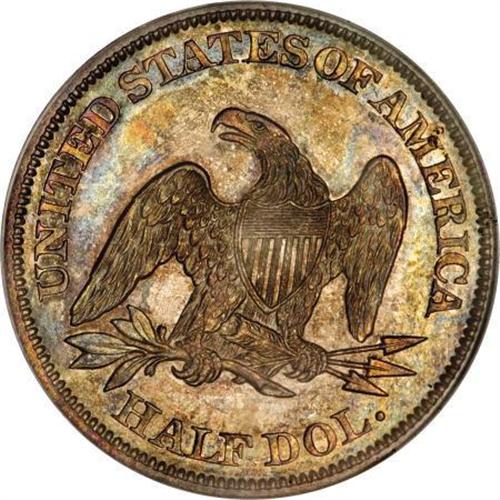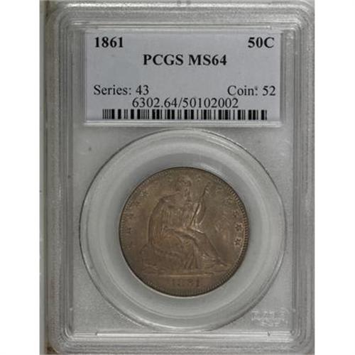 <B>1861 50C MS64 PCGS.</B></I> Heavy patina is evident over this coin's surfaces, ranging in color from orange-rust to cobalt blue. Luster is a bit subdued on the obverse, but readily evident on the reverse. This is a well-struck coin with minimal surface markings, none of which are individually noteworthy.<BR><BR><B>Coin Engraver:</B> Christian Gobrecht<BR><BR><b>Shipping:</b> Coins & Currency (<a target="_blank" href="http://www.heritageauctions.com/common/shipping.php">view shipping information</a>)