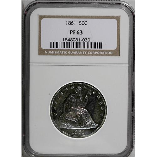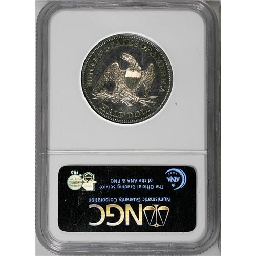 <B>1861<50C> PR63 NGC.</B></I> Deep mirrors and bold devices mark this Seated proof, as does the patina, a lovely combination of violet and electric blue. Census: 23 in 63, 42 finer (6/06).<BR><I>Ex: Stack's, 7/52, lot 413.</B></I><BR><I>From The Redfjord Collection.</B></I>