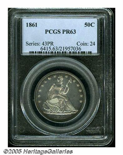 <B>1861<50C> PR63 PCGS.</B></I> Deeply toned about the borders with numerous hairlines in the fields that serve to limit the grade. Still, an attractive proof example of this highly collectible Civil War date.