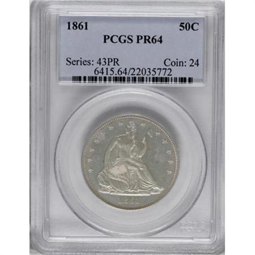 <B>1861 50C PR64 PCGS.</B></I> Exquisitely struck with lovely, creamy alabaster-gold toning and watery reflectivity in the fields. Some milkiness in the right obverse field precludes a finer grade assessment. Apparently most of the 1,000 proofs from this issue were melted, and today Choice specimens are surprisingly scarce. Population: 16 in 64, 10 finer (11/07). <BR><I>From The Kallenberg #1 PCGS Registry Set Of Proof Half Dollars.</B></I><BR><BR><B>Coin Engraver:</B> Christian Gobrecht<BR><BR><b>Shipping:</b> Coins & Currency (<a target="_blank" href="http://www.heritageauctions.com/common/shipping.php">view shipping information</a>)