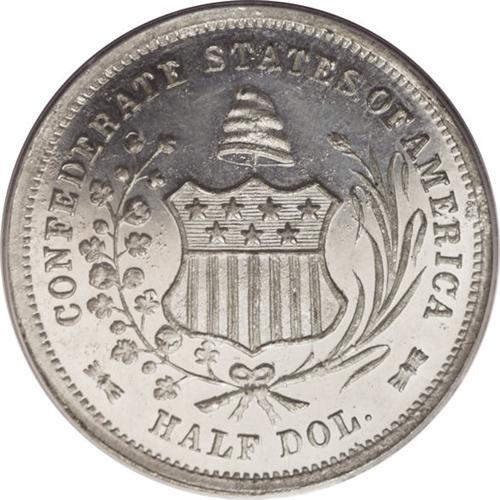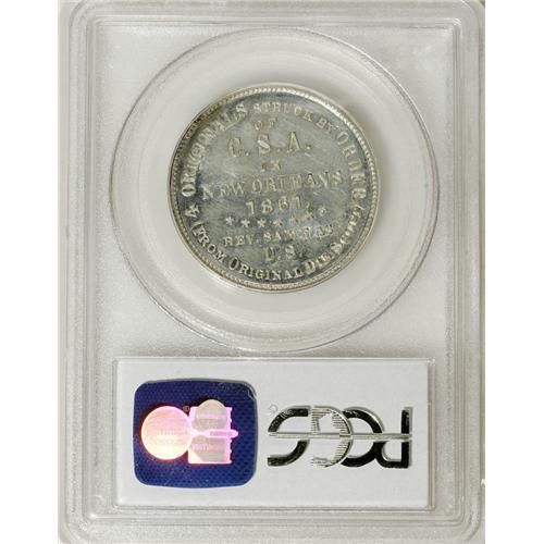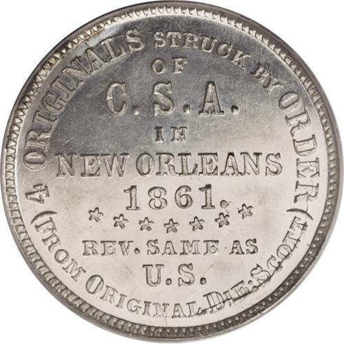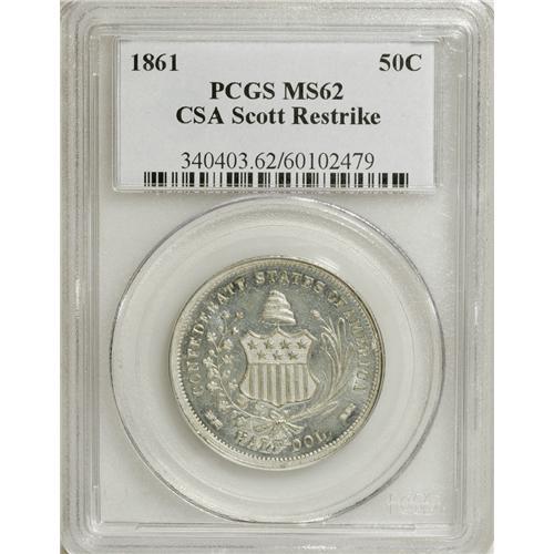 <B>1861 50C Scott Confederate White Metal Token MS62 PCGS.</B></I> The Confederate half dollar reverse engraved by A.H.M. Patterson, with the denomination HALF DOL., is rife with symbolism of the issues that were central to the War Between the States. A Liberty cap perches on a shield of defense, representing freedom from Northern intervention for the Southern way of life. Seven stars and seven stripes appear on the shield, for the seven states of the Deep South that seceded from the Union after Abe Lincoln was elected in 1860. On the left half of the wreath stands a cotton plant. Cotton was central to the South's agricultural economy, requiring intense labor (in the form of slaves) to harvest. The wreath's right side is a palm frond, standing for triumph and victory.<BR> The New Orleans Mint struck four original Confederate half dollars in 1861, using the regular Seated Liberty obverse die and the new Patterson reverse. J.W. Scott obtained the original CSA half dollar die in the 1870s and made 500 restrikes from the die in soft white metal, of which the present coin is an example. The obverse has the well-known Scott advertising inscription 4 ORIGINALS STRUCK BY ORDER OF C.S.A. IN NEW ORLEANS 1861. Below the date, seven stars precede REV. SAME AS U.S. and (FROM ORIGINAL DIE: SCOTT). Scott combined this obverse with the original reverse and struck 500 tokens, which he sold in October 1879 for 50 cents each. This piece shows a lightly pebbled reverse from the die rust that would have undoubtedly formed between 1861 and 1879, along with the flaw at ER in AMERICA that is diagnostic of genuine pieces. Both sides are brilliant, with a few stray contact marks that determine the grade.<BR><BR><b>Shipping:</b> Coins & Currency (<a target="_blank" href="http://www.heritageauctions.com/common/shipping.php">view shipping information</a>)