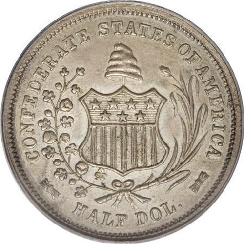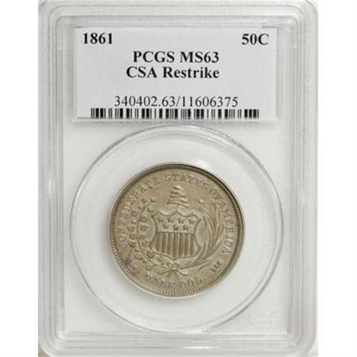 <B>1861 50C Scott Restrike MS63 PCGS.</B></I> This is one of the more interesting stories in the annals of Southern or Confederate coinage. The New Orleans Mint was briefly under the control of the State of Louisiana, and later the Confederacy, when the production of Confederate coinage was considered. The Confederate Congress was interested in having a currency distinct from that of the United States, and even contemplated the establishment of a denomination called the Cavalier, which would have been equal initially to five American dollars. Confederate coinage never became a reality, per se, but the reverse design of this type was saved from die trials conducted at the New Orleans Mint. Ironically, these so-called "Scott Restrikes" (for J.W. Scott and Company) were manufactured in the heart of Yankee territory in New York City, circa 1879. This piece is well struck and nicely preserved, showing good luster and few surface disturbances on either side. Very scarce at the Select grade level, and rare any finer. Population: 9 in 63, 3 finer (7/07).<BR><BR><b>Shipping:</b> Coins & Currency (<a target="_blank" href="http://www.heritageauctions.com/common/shipping.php">view shipping information</a>)