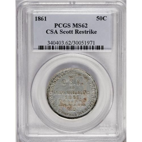 <B>1861<50C> Scott Token MS62 PCGS.</B></I> Breen-8003. From circa 1879, these tokens were produced using the original Confederate States of America reverse die, combined with an obverse die designed by Scott. The surfaces of this example are deeply toned in shades of charcoal and silver-gray. Listed on page 375 of the 2007 <I>Guide Book.</B></I><BR><I>From The Clifton Rodenburg Collection.</B></I>
