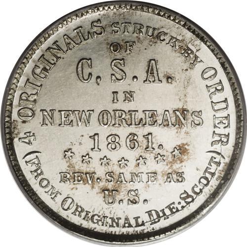<B>1861 50C Scott Token MS62 PCGS.</B></I> Breen-8003. From circa 1879, these tokens were produced using the original Confederate States of America reverse die, combined with an obverse die designed by Scott. The surfaces of this example are deeply toned in shades of charcoal and silver-gray. Listed on page 375 of the 2007 <I>Guide Book.</B></I><BR><BR><b>Shipping:</b> Coin/Currency (<a target="_blank" href="http://www.heritageauctions.com/common/shipping.php">view shipping information</a>)