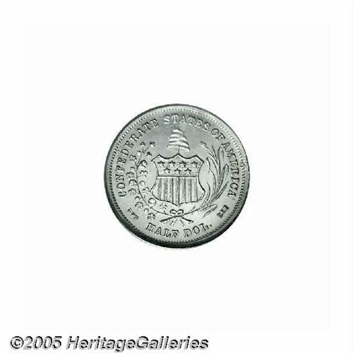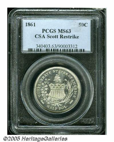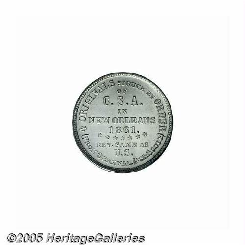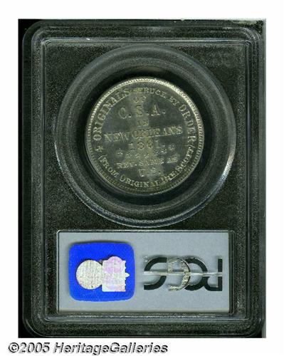 <B>1861<50C> Scott Token MS63 PCGS.</B></I> Several years after discovery of the original CSA Half Dollar dies, Scott prepared a special obverse die for restrikes with the inscription 4 ORIGINALS STRUCK BY ORDER OF C.S.A. IN NEW ORLEANS 1861 around the upper periphery and in the center. Below the date, an arch of seven stars precedes the inscriptions REV. SAME AS U.S. and, in parentheses, FROM ORIGINAL DIE: SCOTT. Scott combined this obverse die with the original reverse die and struck 500 tokens, which he sold in October, 1879 for 50 cents each. These tokens were struck in a white metal that Breen (1988) asserts is probably tin. This piece exhibits some streaky, milky color on each side with much brightness still remaining around the devices.