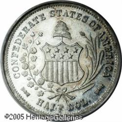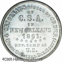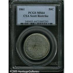 <B>1861 50C Scott Token MS64 PCGS.</B></I> When the Confederate Government took over the New Orleans Mint in 1861, they considered producing their own coinage. They even had a special reverse die made for half dollars, and struck a few samples. The project never continued, although the die was not destroyed. Later, John W. Scott obtained the reverse die, and produced a number of restrikes from existing 1861-O half dollars. He also produced these Scott tokens, with the reverse of the Confederate half dollar and a special obverse that tells the story: ORIGINALS STRUCK BY ORDER OF C.S.A. IN NEW ORLEANS 1861. REV. SAME AS U.S. (FROM ORIGINAL DIES: SCOTT). These Scott Tokens are highly collectible and popular today. This example is sharply struck with prooflike surfaces and splashes of brown toning, mostly on the reverse. Lot:10808