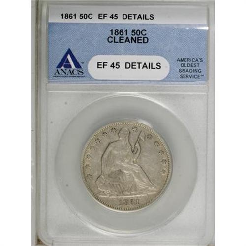 <B>1861 50C --Cleaned--ANACS. XF45 Details. </B></I> NGC Census: (11/291). PCGS Population (17/287). Mintage: 2,888,400. Numismedia Wsl. Price for NGC/PCGS coin in XF45: $146. (#6302)<BR><BR><B>Coin Engraver:</B> Christian Gobrecht<BR><BR><b>Shipping:</b> Coins & Currency (<a target="_blank" href="http://www.heritageauctions.com/common/shipping.php">view shipping information</a>)