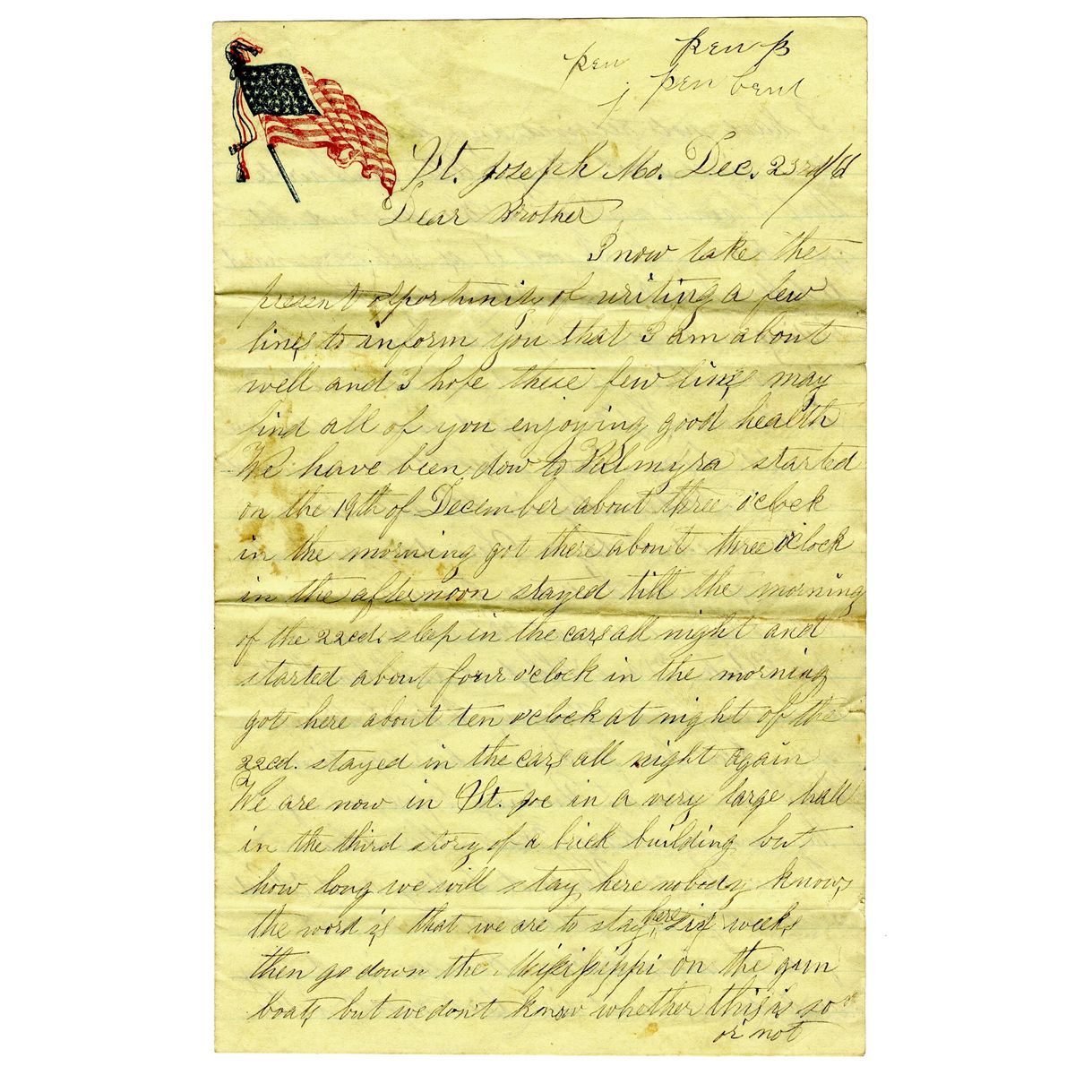 4pp. letter from George W. Stauffer of the 50th Illinois Infantry, Company D, to his brother. Datelined ''St. Joseph Mo. Dec. 23rd /61,'' letter reads in part: ''…We have been down to Palmyra started on the 19th of December about three o'clock in the morning got there about three o'clock in the afternoon, stayed till…the 22nd, slept in cars…We are now in St. Joe in a…large hall in the third story of a brick building but how long we will stay here nobody knows. The word is we are to stay here six weeks then go down the Mississippi on the gun boats but we don't know whether this is so or not…it is not very hard to tell where I was on Sunday. I was riding in an old freight car and crowded like everything, we had our stove set up in it and kept on a good fire or else we would have nearly froze. It commenced snowing Saturday in the afternoon and snowed all day Sunday and the snow is on an average, I guess, six inches deep…'' Stauffer mustered into Company D on September 1861 and, after participating in the Grand Review, was discharged as a Corporal in July 1865. The 50th Illinois Infantry saw action at Fort Donelson and Shiloh as well as in Sherman's March to the Sea. Ink letter measures 5'' x 8''. Some soiling, otherwise excellent condition.