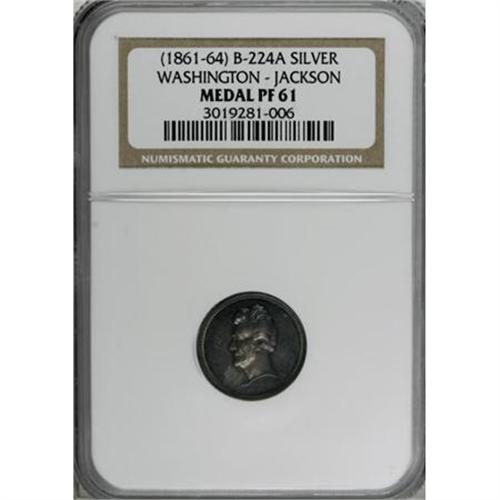 <B>(1861-64) Washington-Jackson Medal MS61 NGC.</B></I> B-224A, Julian PR-28. Silver. The high busts of the two presidents are fully struck. Rich aquamarine toning helps conceal faint hairlines on each side.<BR><BR><b>Shipping:</b> Coins & Currency (<a target="_blank" href="http://www.heritageauctions.com/common/shipping.php">view shipping information</a>)