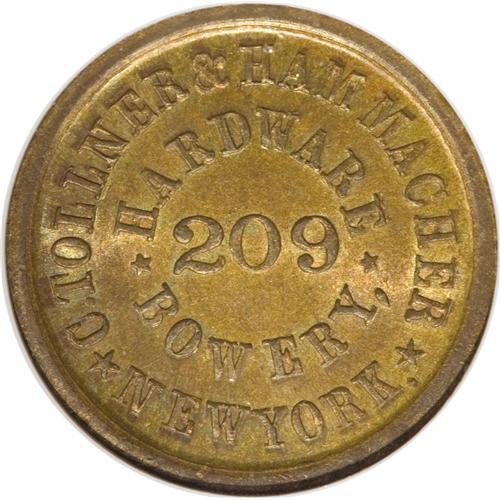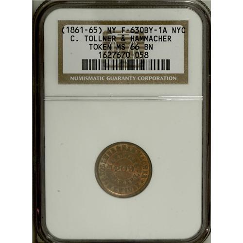 <B>(1861-65) C. Tollner and Hammacher, Fuld-NY-630BY-1a, R.3, MS66 Brown NGC.</B></I> Copper. Another high grade Civil War token, exhibiting a fair amount of original mint luster with deep orange coloring.<BR><BR><b>Shipping:</b> Coin/Currency (<a target="_blank" href="http://www.heritageauctions.com/common/shipping.php">view shipping information</a>)