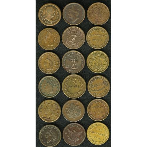 <B>1861-65 Civil War Token Group Lot.</B></I> Consists of 18 miscellaneous unattributed Civil War merchant and patriotic tokens. The condition of the tokens varies; the current market value is approximately $175-$300.<BR><BR><b>Shipping:</b> Coins & Currency (<a target="_blank" href="http://www.heritageauctions.com/common/shipping.php">view shipping information</a>)