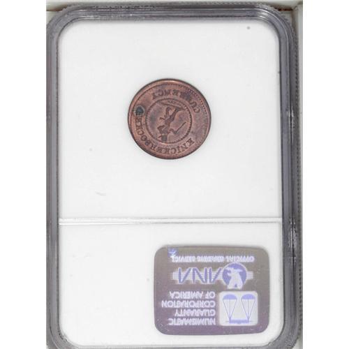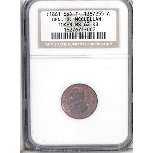 <B>(1861-65) General G. McClellan, Fuld-138/255a, R.2, MS62 Red and Brown NGC.</B></I> This token has more than 50% of the original luster remaining.